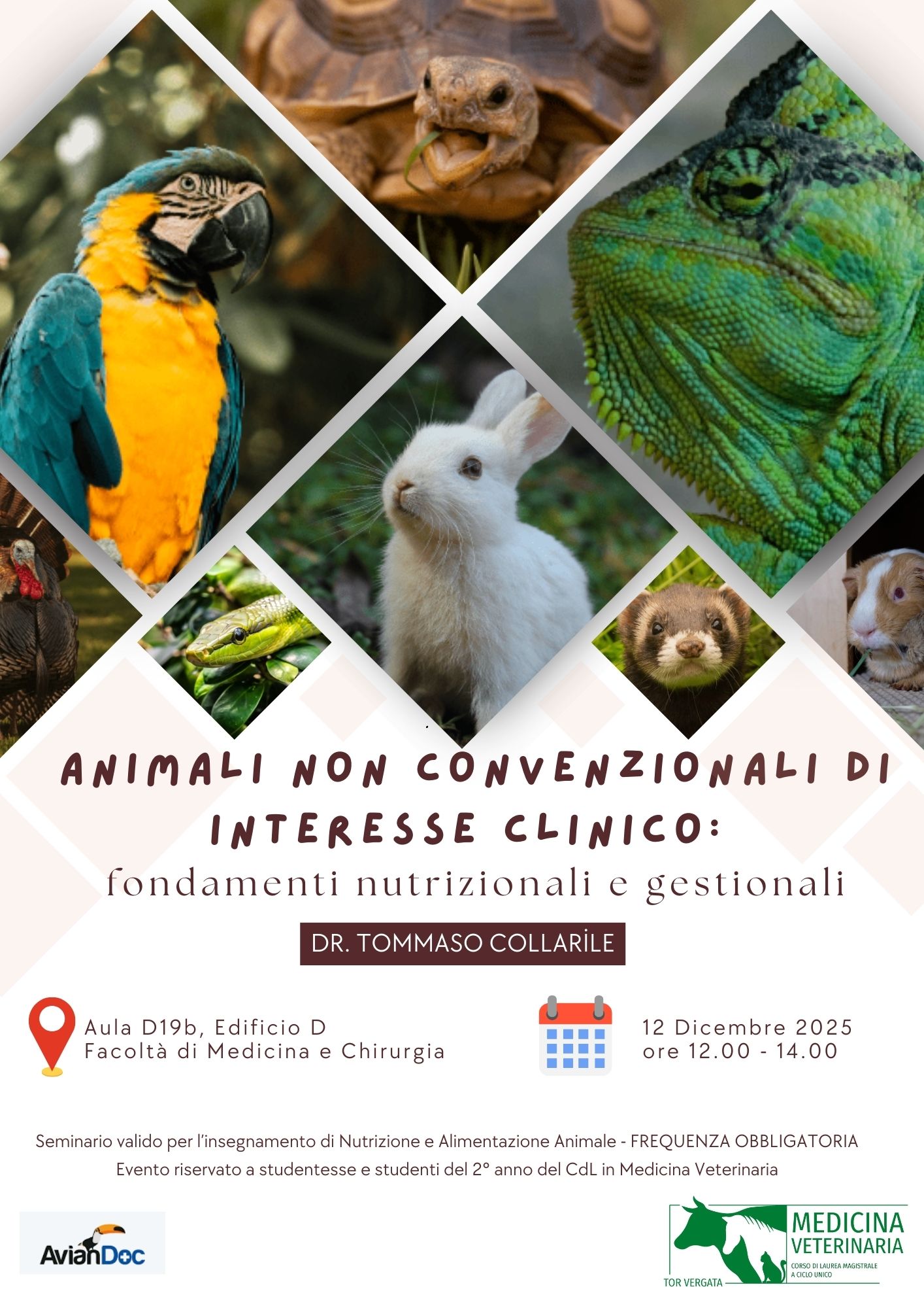 All’interno dell’insegnamento di Nutrizione e Alimentazione Animale, il seminario propone un approfondimento dedicato agli animali non convenzionali, con particolare attenzione agli aspetti nutrizionali e alle corrette pratiche gestionali. Un’occasione per ampliare le competenze sugli approcci clinici e dietetici rivolti a specie che richiedono conoscenze specifiche e aggiornate.